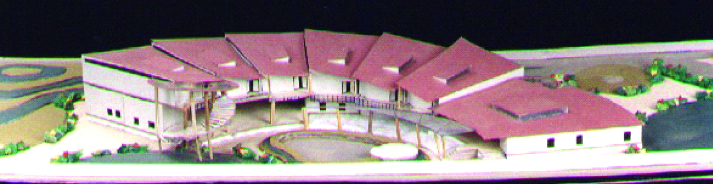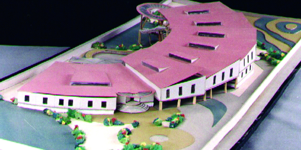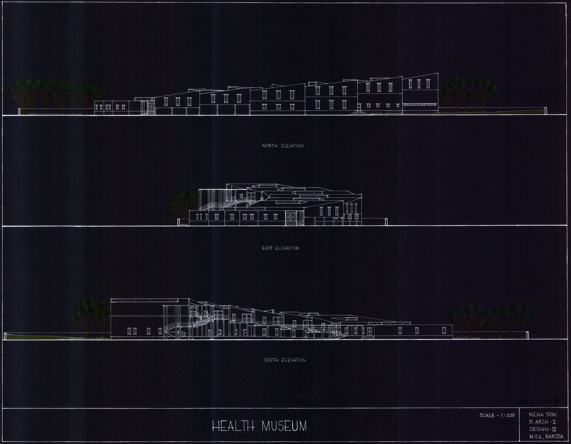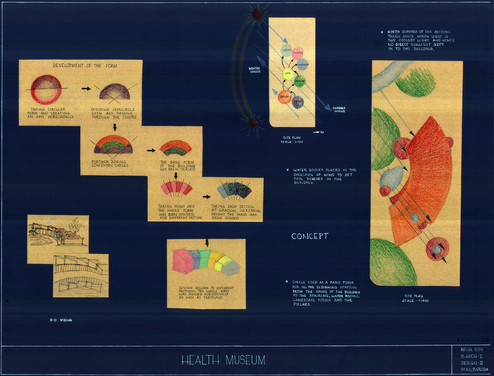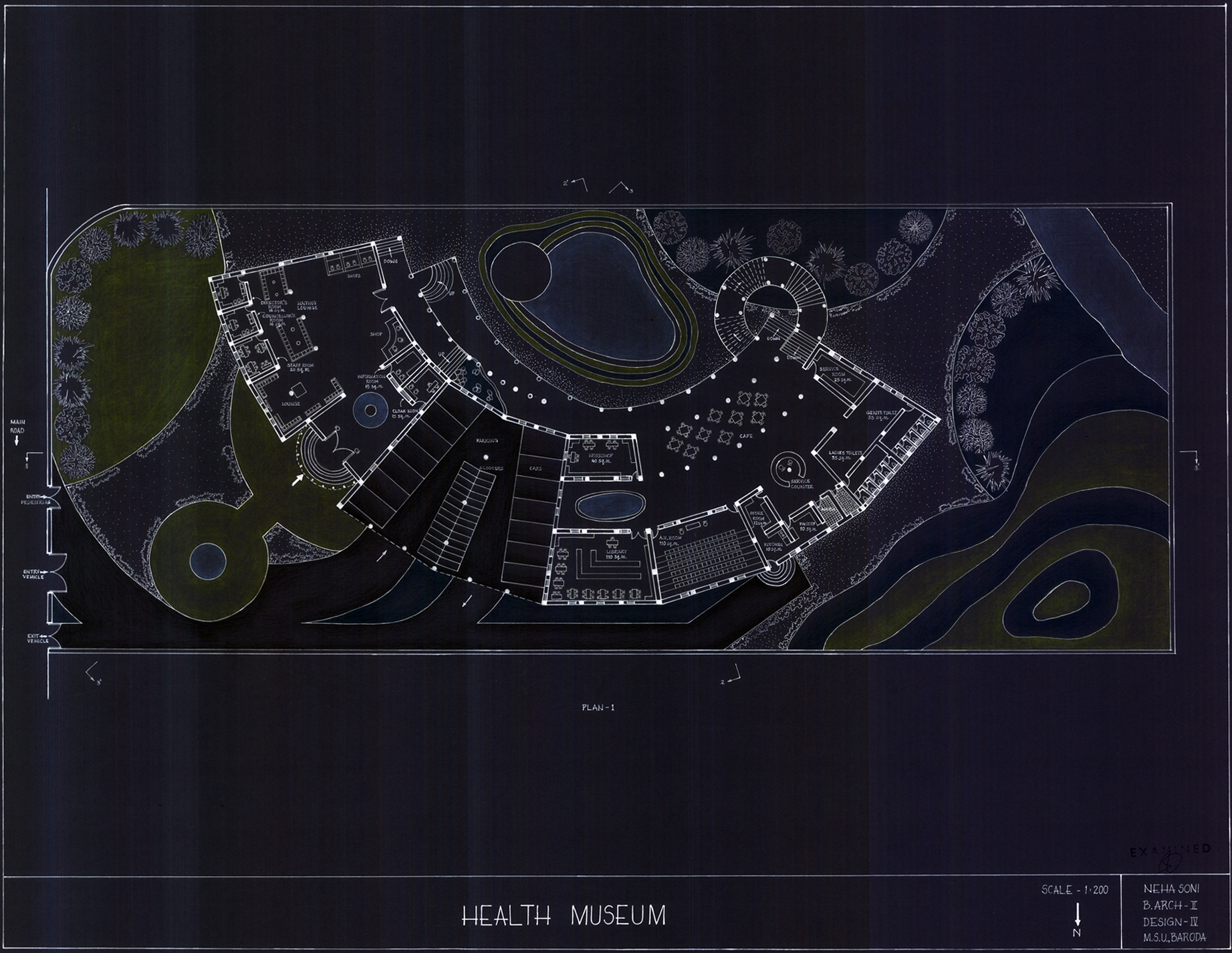 This is one of my favorite projects from the initial studios of B.Arch when all drawings were hand rendered with the difficult task of white inking on dark blue sheets. It was like making a painting! The project was to make a health museum for children. Inspired by the gradual rising levels of Guggenheim museum typology, I thought of exploring a crescent shape that gradually increased in height. Each level could be used for a different exhibit. So, let us say, the first level could house items on basic health awareness, it could gradually go higher in the level of health awareness like understanding of the nervous system and brain. The exit from the top level goes below to the lower level into a cafe and gift shop, from where people could get out of the museum into outdoor landscaping. Some of the spaces below the rising levels could be used for service and admin areas. Also, each level could have central skylight. The organic landscaping around the crescent shape museum blended the built form with the surroundings.