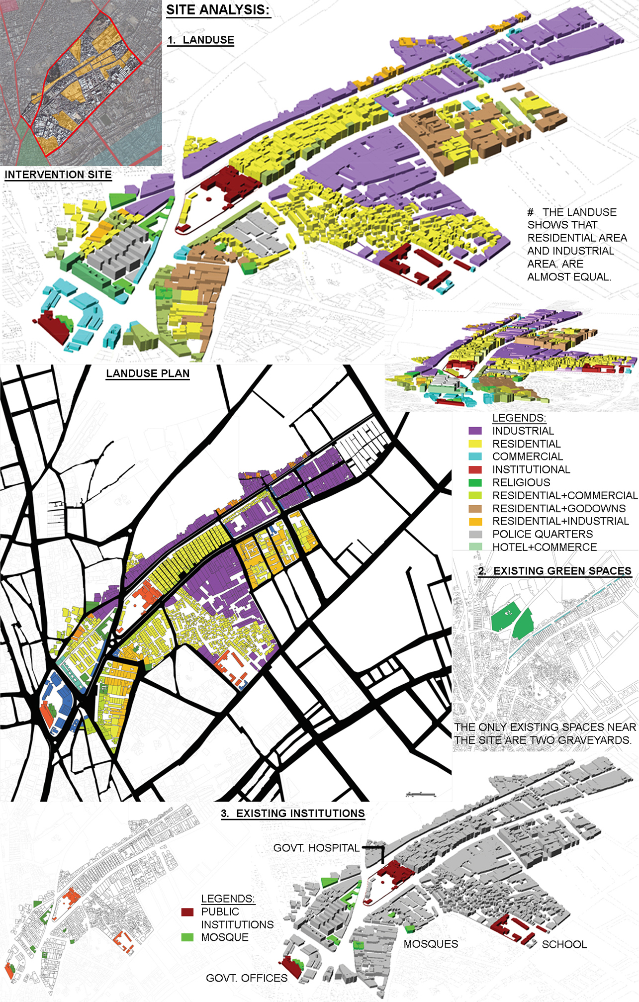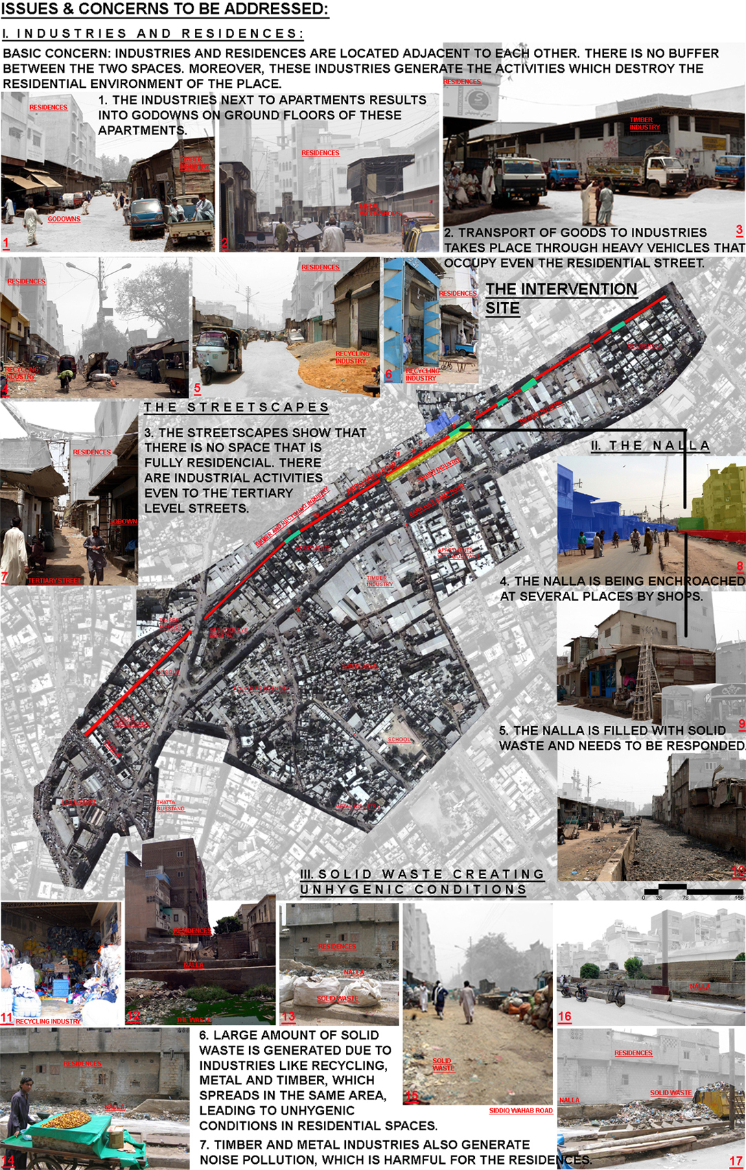 The studio ‘Urban Transformation’ was aimed at demonstrating how transformation can be addressed in an existing urban fabric. In doing so, the challenge was to bring a positive impact for a long-term sustained change. The project site was located in the densely populated old city of Karachi, where a large number of small-scale industries, wholesale markets, and various traditional retail markets were located adjacent to residential neighborhoods. The environmental quality had degraded over years in the mixed-use urban setting due to hazardous industrial pollution. After visiting the site, my concern grew strongly for the people living in the area. With poor land regulations in the city, it was a tough challenge to figure out what could be that ‘change’? Within the paradigm of design, I proposed small incremental changes like creating pockets of open green spaces, tree-lined screening along the open drain lines, aesthetically pleasing streetscape, the possible creation of buffer spaces between residential, and industrial areas and regulating building typologies. These small changes if introduced into the overall urban fabric could lead to reinforcing progressive changes over time in order to improve the quality of life.