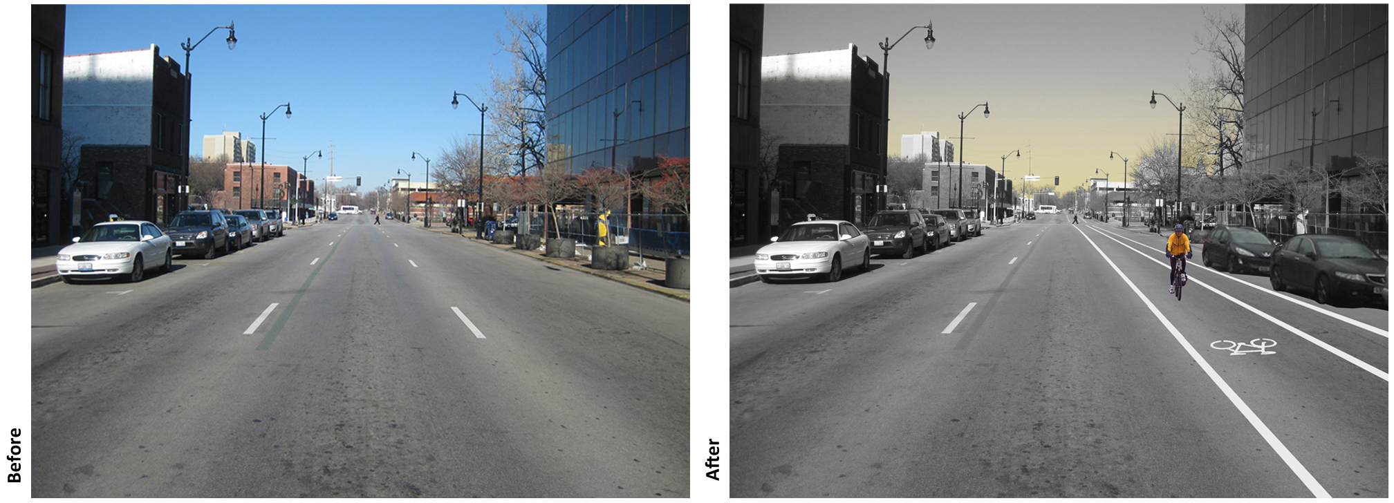 The Visual simulations of the proposed Bike and Pedestrian Planning for Springfield were presented during public meetings to help residents gain a better understanding of their future city streets once the plan gets implemented. The visuals present before and after scenarios with different facilities being proposed for various streets throughout the city.
